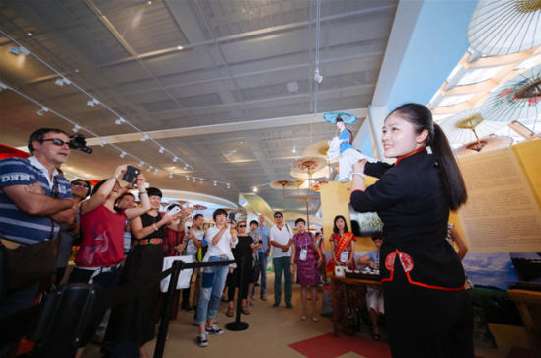 福建活動日的中國館好戲連臺,先后演出中國稀有劇種,包括閩劇《雙驕公主》、高甲戲《公子坐場》、掌中木偶戲《布袋雜耍》等,演繹了福建傳統(tǒng)戲劇的千年雅韻;畬歌畬舞表演,洋溢著濃濃的福建民族獨特風俗風情,將觀眾的思緒引向福建畬鄉(xiāng)濃郁的“山哈”芬芳;詠春拳與福建龍人古琴的聯(lián)袂表演,音樂、武術相融合,讓觀眾沉醉在福建非遺傳承技藝剛柔并濟的律動之美。