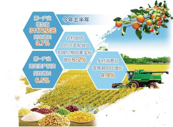 國家統(tǒng)計(jì)局最新數(shù)據(jù)顯示,上半年第一產(chǎn)業(yè)增加值31172億元,同比增長3.7%。今年以來,農(nóng)業(yè)農(nóng)村部門全力抓好糧食和重要農(nóng)產(chǎn)品穩(wěn)產(chǎn)保供,毫不松懈鞏固拓展脫貧攻堅(jiān)成果,統(tǒng)籌推進(jìn)鄉(xiāng)村產(chǎn)業(yè)發(fā)展、鄉(xiāng)村建設(shè)和鄉(xiāng)村治理,農(nóng)業(yè)農(nóng)村經(jīng)濟(jì)運(yùn)行總體平穩(wěn)、穩(wěn)中向好,夏糧穩(wěn)產(chǎn)豐收,農(nóng)民穩(wěn)步增收,農(nóng)村穩(wěn)定安寧,為國民經(jīng)濟(jì)平穩(wěn)運(yùn)行提供了堅(jiān)實(shí)支撐。
