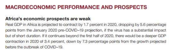 非洲開發(fā)銀行日前也發(fā)布報(bào)告說(shuō),根據(jù)疫情影響程度不同的兩種情況預(yù)測(cè),今年非洲經(jīng)濟(jì)可能萎縮1.7%或3.4%。