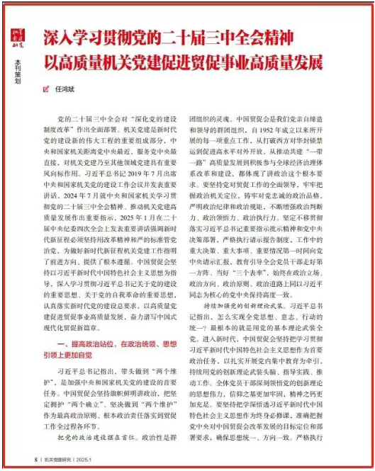 黨的二十屆三中全會對“深化黨的建設制度改革”作出全面部署。機關黨建是新時代黨的建設新的偉大工程的重要組成部分,中央和國家機關距離黨中央最近,服務黨中央最直接,對機關黨建乃至其他領域黨建具有重要風向標作用。習近平總書記2019年7月出席中央和國家機關黨的建設工作會議并發(fā)表重要講話,2024年7月就中央和國家機關學習貫徹黨的二十屆三中全會精神、推動機關黨建高質量發(fā)展作出重要指示,2025年1月在二十屆中央紀委四次全會上發(fā)表重要講話強調(diào)新時代新征程必須堅持用改革精神和嚴的標準管黨治黨,為做好新時代新征程機關黨建工作指明了前進方向,提供了根本遵循。中國貿(mào)促會堅持以習近平新時代中國特色社會主義思想為指導,深入學習貫徹習近平總書記關于黨的建設的重要思想、關于黨的自我革命的重要思想,認真落實新時代黨的建設總要求,以高質量黨建促進貿(mào)促事業(yè)高質量發(fā)展,奮力譜寫中國式現(xiàn)代化貿(mào)促新篇章。