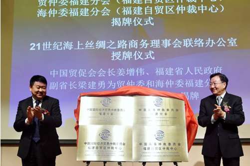 ? ? ? ?中國貿(mào)促會會長姜增偉、福建省人民政府副省長梁建勇出席揭牌儀式,并共同為貿(mào)仲委福建分會、貿(mào)仲委福建自貿(mào)區(qū)仲裁中心以及海仲委福建分會、海仲委福建自貿(mào)區(qū)仲裁中心揭牌。中國貿(mào)促會副會長尹宗華、福建省貿(mào)促會會長張秋、貿(mào)仲委副主任兼秘書長于健龍、國務院法制辦中國仲裁協(xié)會籌備領導小組副組長盧云華等國家和地方有關部門領導出席揭牌儀式。兩岸經(jīng)貿(mào)界、仲裁界近200名代表到場共同見證了這一重要歷史時刻。